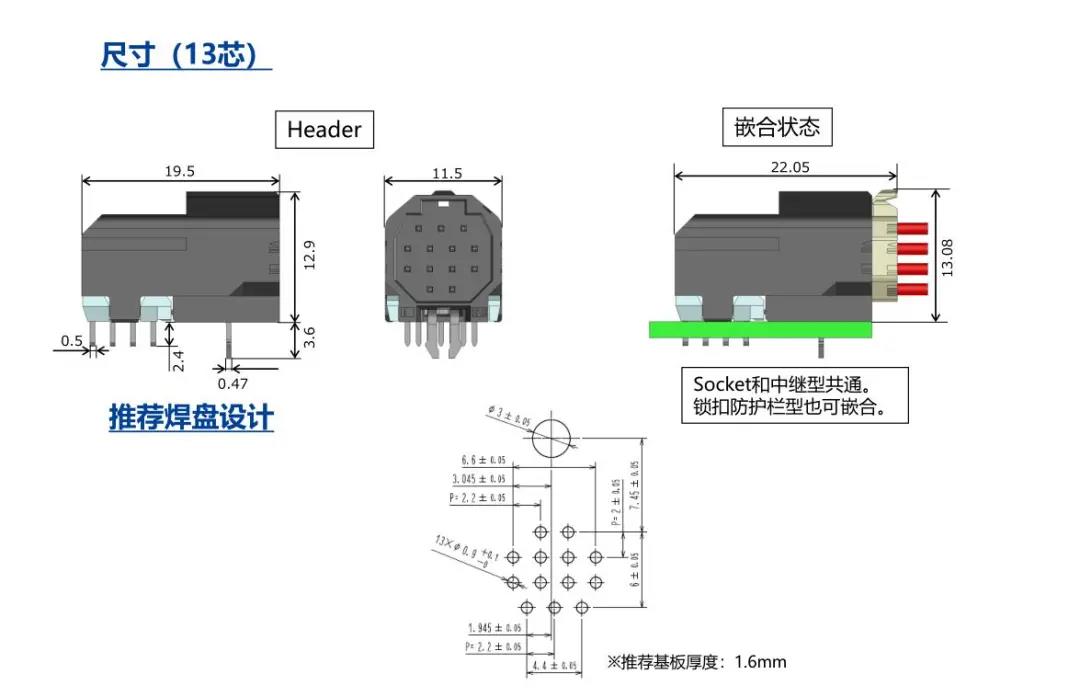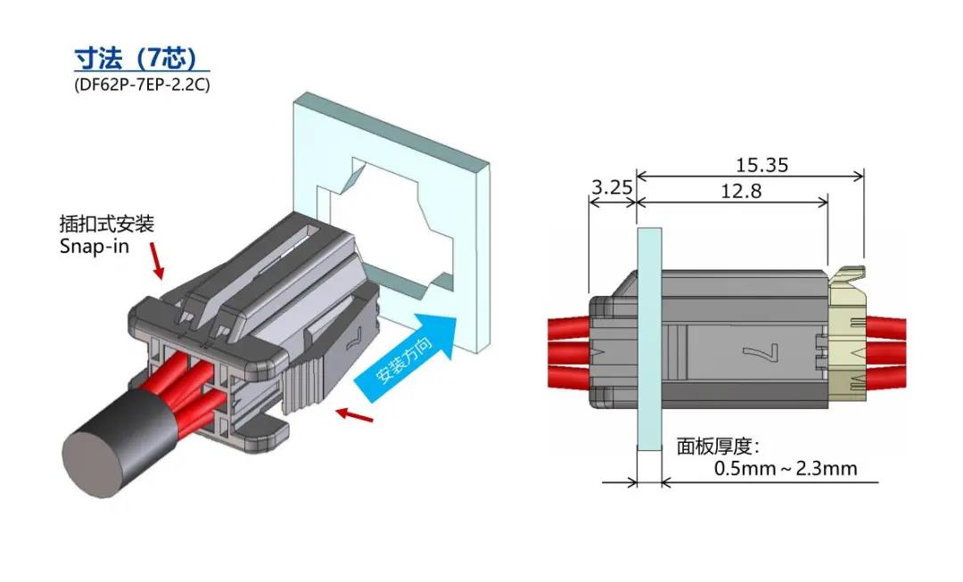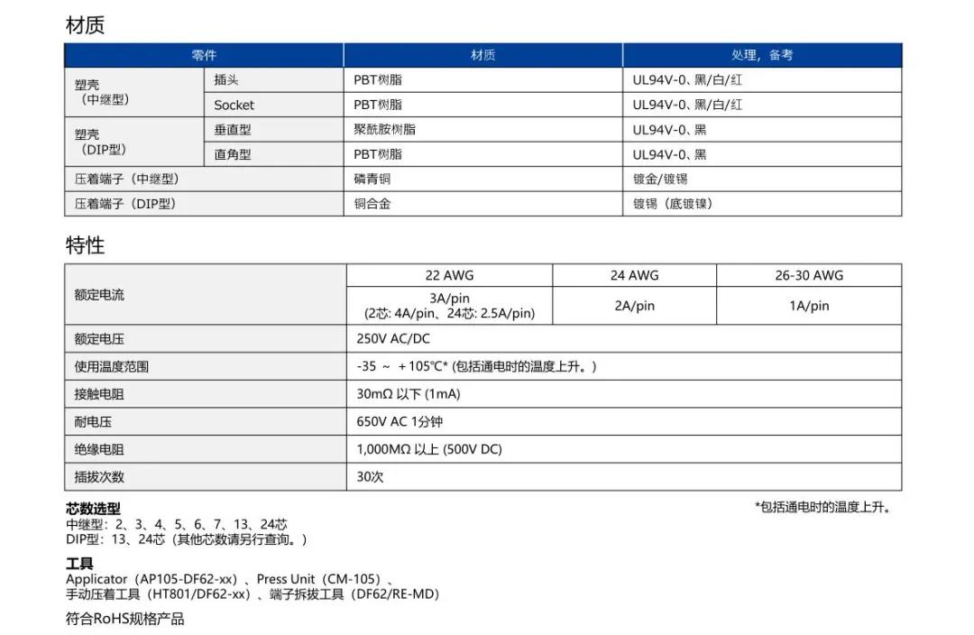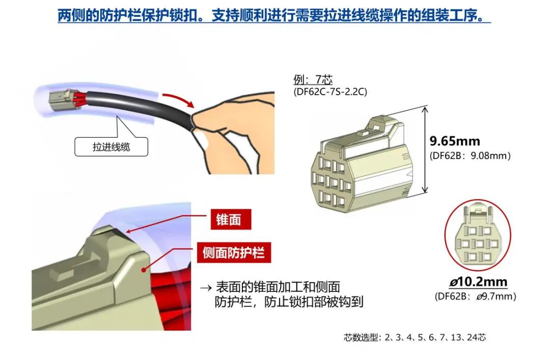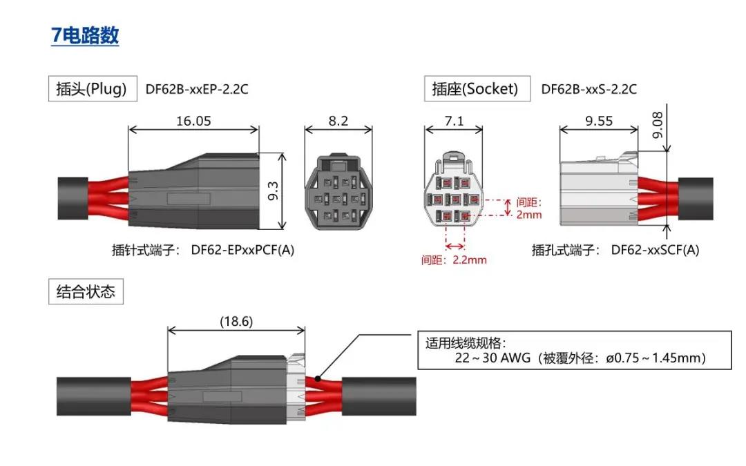 特點 [SignalBee?] 2 x 2.2 mm間距 用于狹小空間纖細型中繼連接器(UL C-UL認證產(chǎn)品) 1. 纖細光滑的外形適合狹窄空間的布線 2. 清晰的鎖扣感和目視可確認是否鎖定 3. 可靠的接觸結(jié)構(gòu) 4. 堅固的端子結(jié)構(gòu) 5. 芯數(shù)選型:2、3、4、5、6、7、13、24 DF62B:標(biāo)準(zhǔn)型 DF62C:鎖加部保護強化型 DF62P:面板安裝型 6. 可與DF11/DF59系列共用自動壓著設(shè)備 7. 防冷凝措施(防水型DF62W) 細小