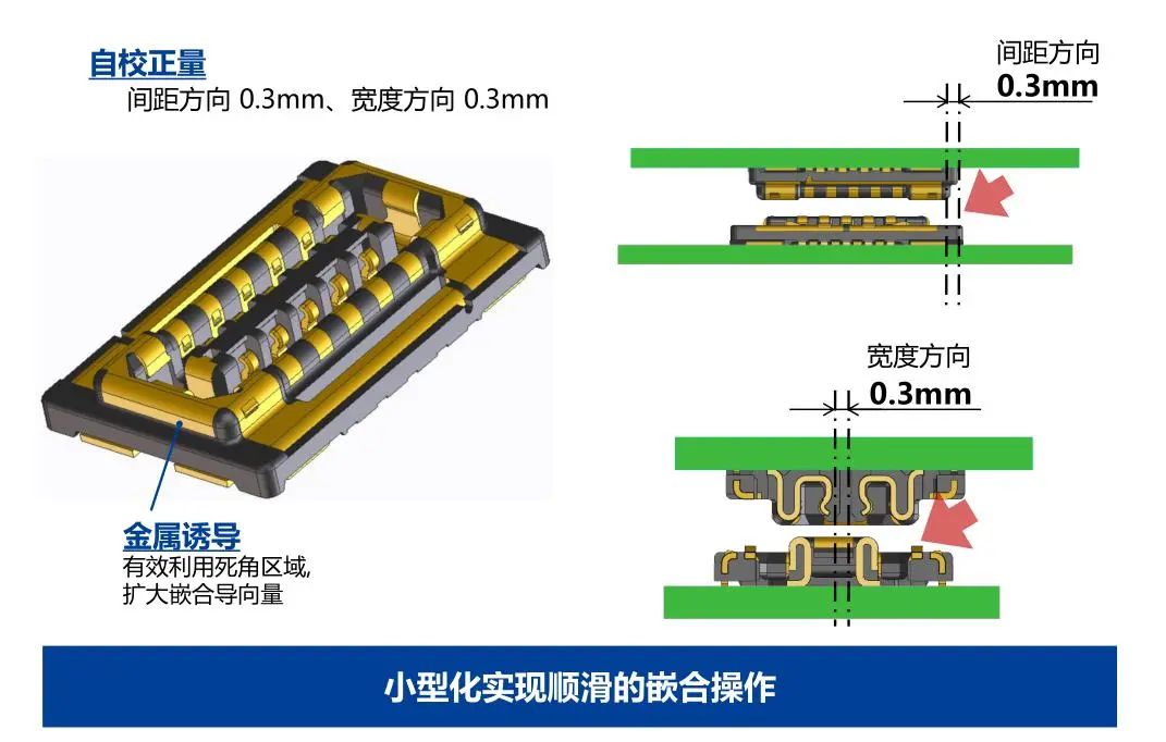 尺寸 省空間 防燥對(duì)策 RF特性(連接器單體) RF特性(連接器+FPC) 牢固構(gòu)造 端子鎖扣構(gòu)造 通過(guò)金屬誘導(dǎo)實(shí)現(xiàn)了較大的自校正量